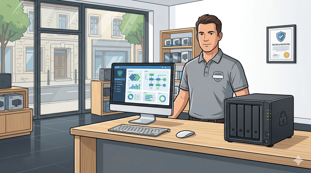 Plan de sauvegarde local et cloud, NAS, procédures de restauration testées. Vos données sont protégées même en cas de sinistre.